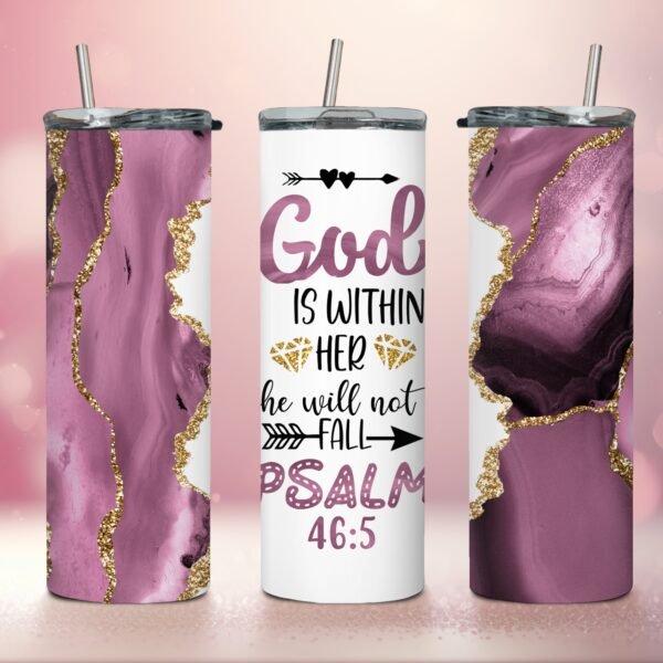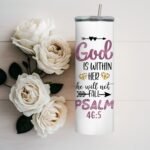 ✝️ Psalm 46:5 Scripture: Engraved with the powerful words “God is within her; she will not fall. God will help her at break of day,” this tumbler serves as a constant source of spiritual inspiration and resilience.