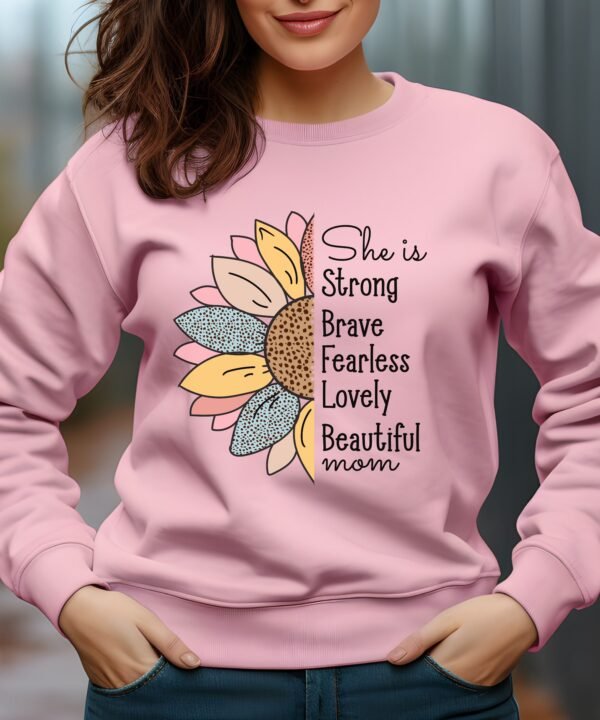 🌸 “She is strong, brave, fearless, lovely mom” – celebrate the remarkable mothers in your life with our empowering sweatshirt, adorned with a beautiful floral design!